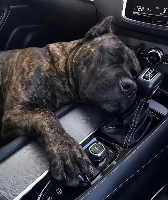 His massive head rested gently on the gear shift, as if it were the most natural pillow in the world. His breathing was slow and deep. His body, powerful and imposing by breed standards, had completely let go.